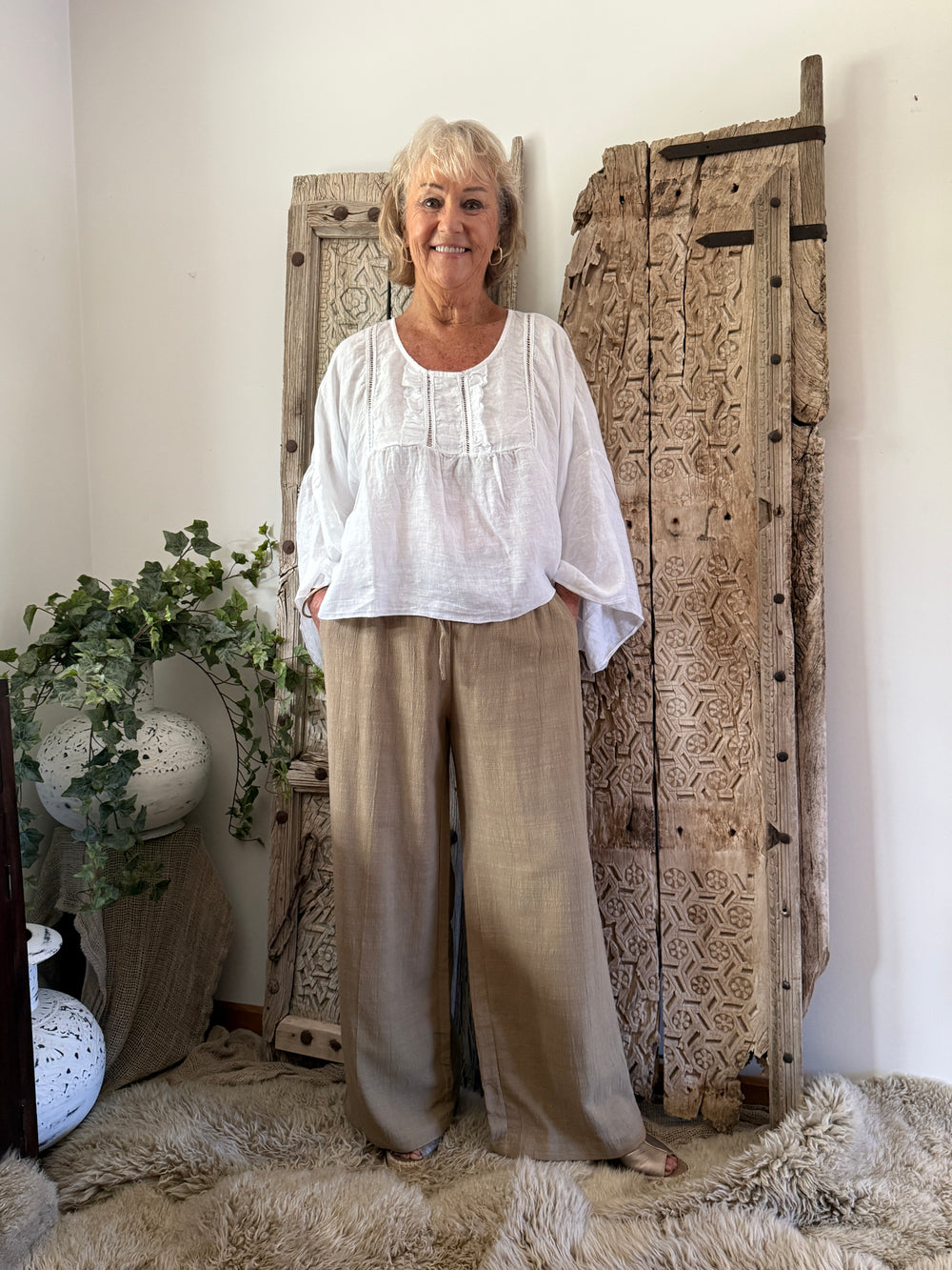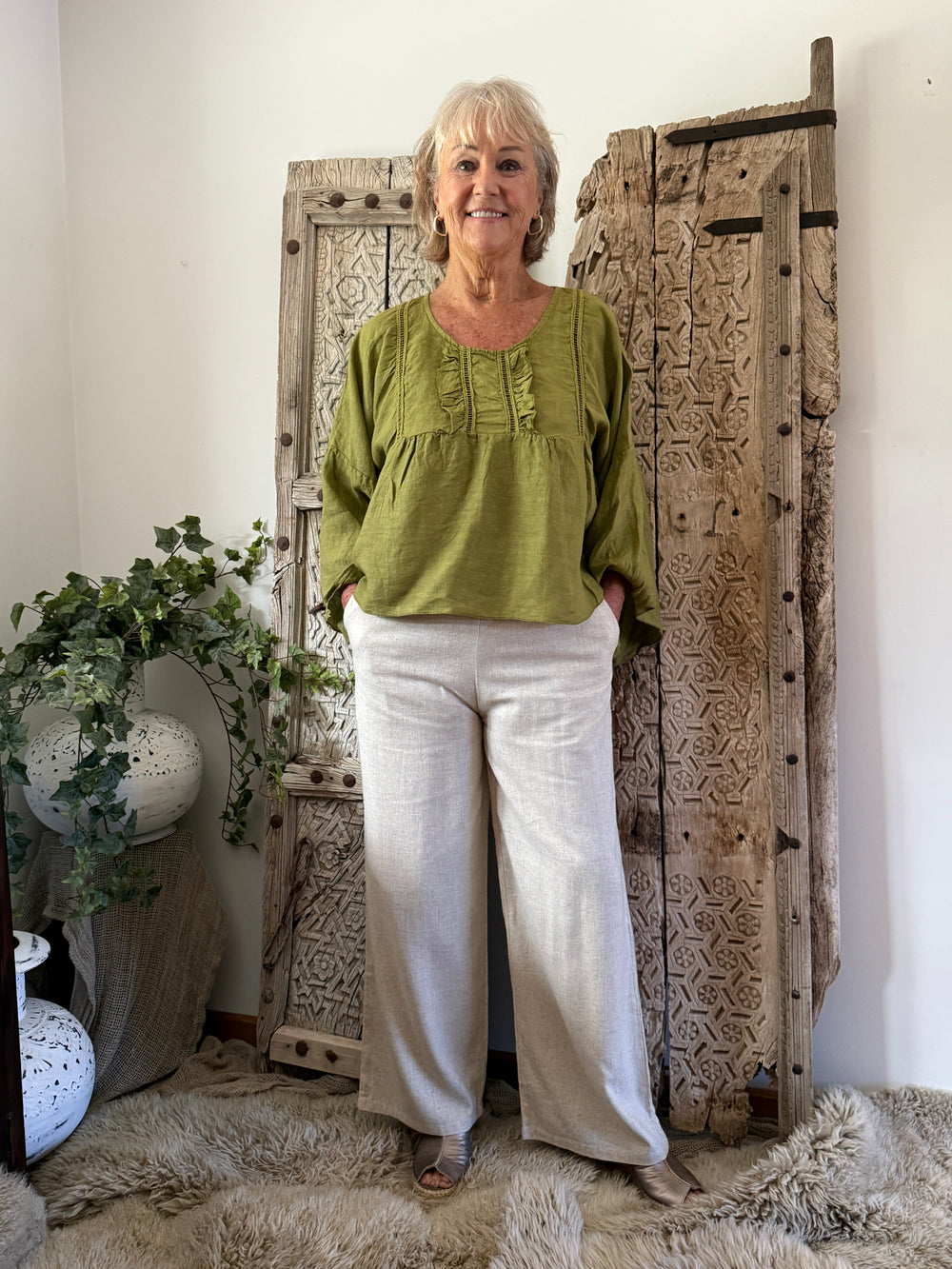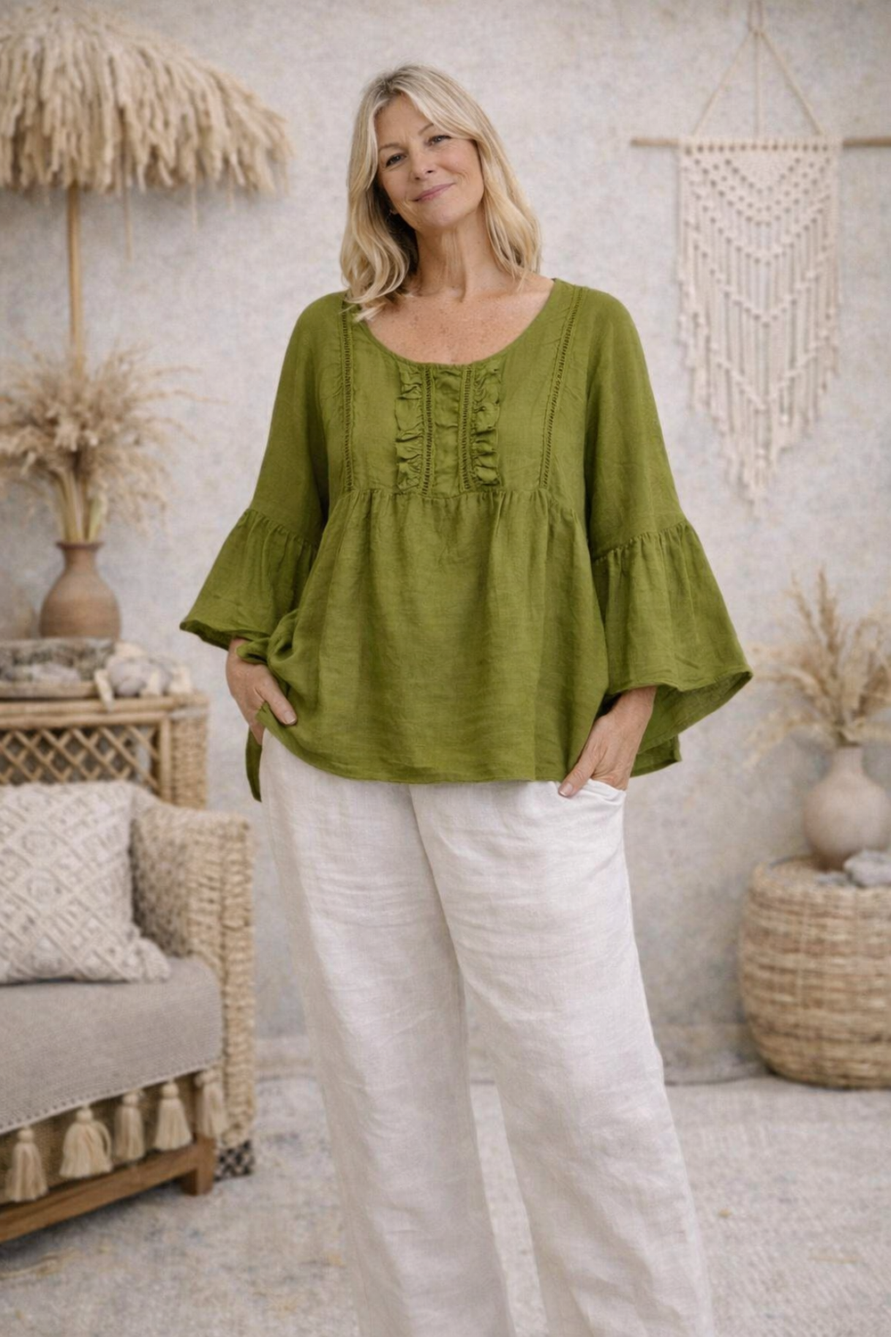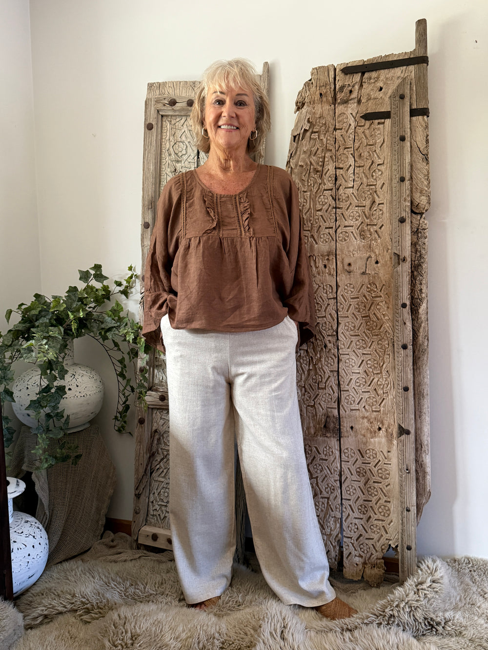 Effortlessly relaxed and timeless, this linen blouse is designed for everyday comfort with understated detail. Crafted in a breathable, natural linen , it features a gently gathered ruffle placket at the neckline for a touch of feminine texture. The relaxed silhouette drapes beautifully, while long sleeves with subtle volume add to its easy, lived-in feel.