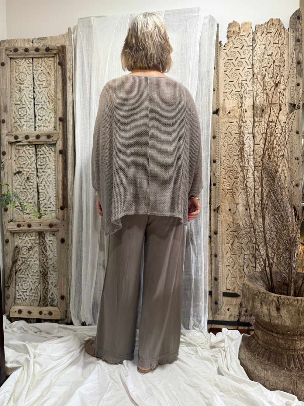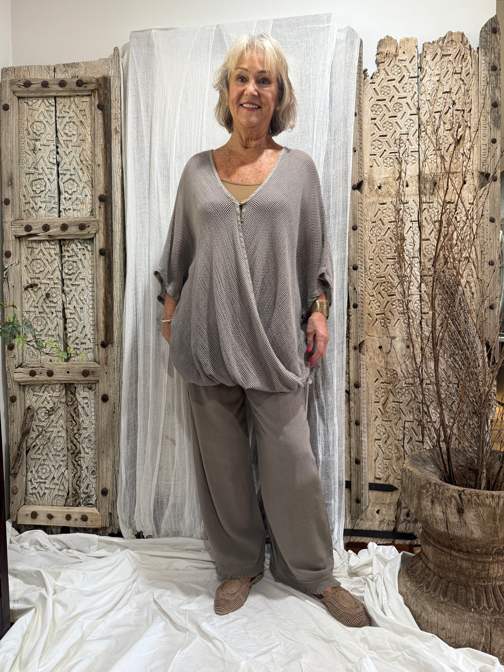 The Isla Crossover Top is a lightweight, draped stype blouse in a soft taupe-grey shade. It has a very relaxed and flowy silhouette, designed for comfort while still looking stylish.