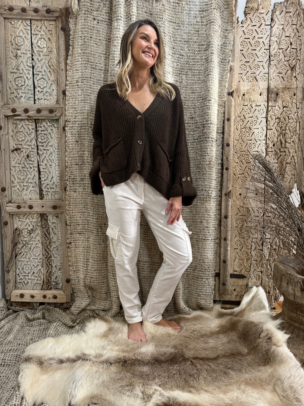 A soft, cozy knit jumper with a relaxed fit and a deep neckline. Perfect for layering or wearing on its own for a laid-back, stylish look.