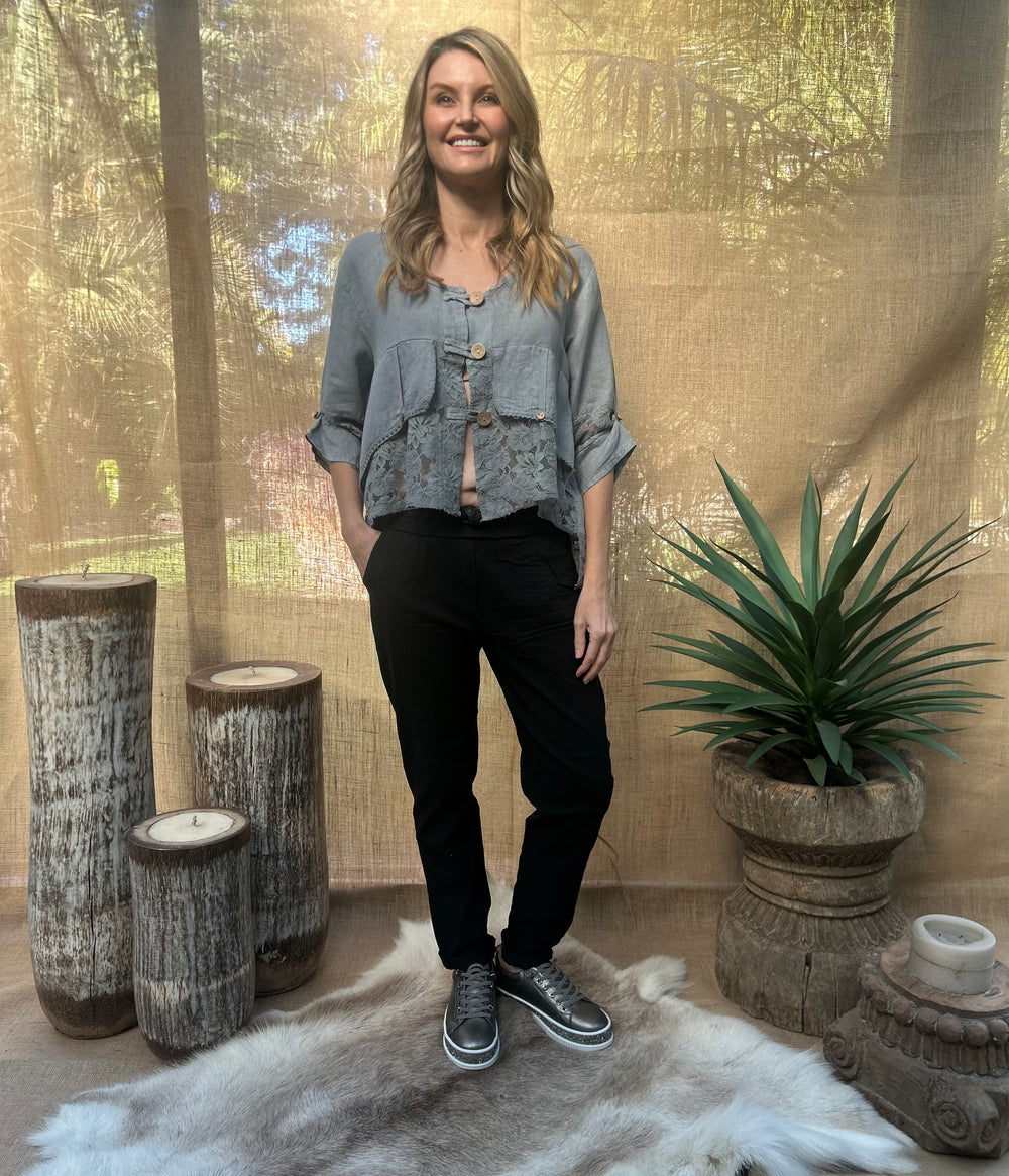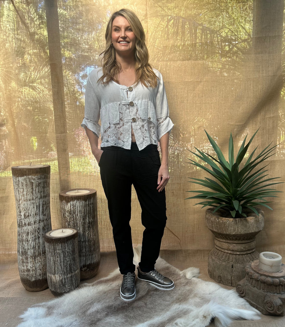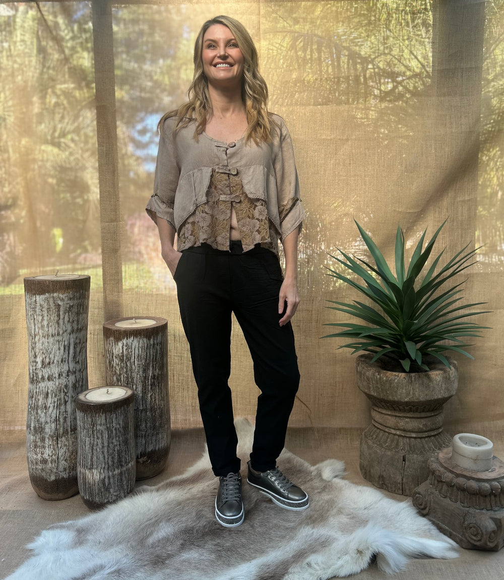 The Jordyn Lacey top is a gorgeous design that gives a layered appearance, with medium length button-up sleeves. It has an elegant look that could be ideal for many occasions, made from comfortable and soft linen.