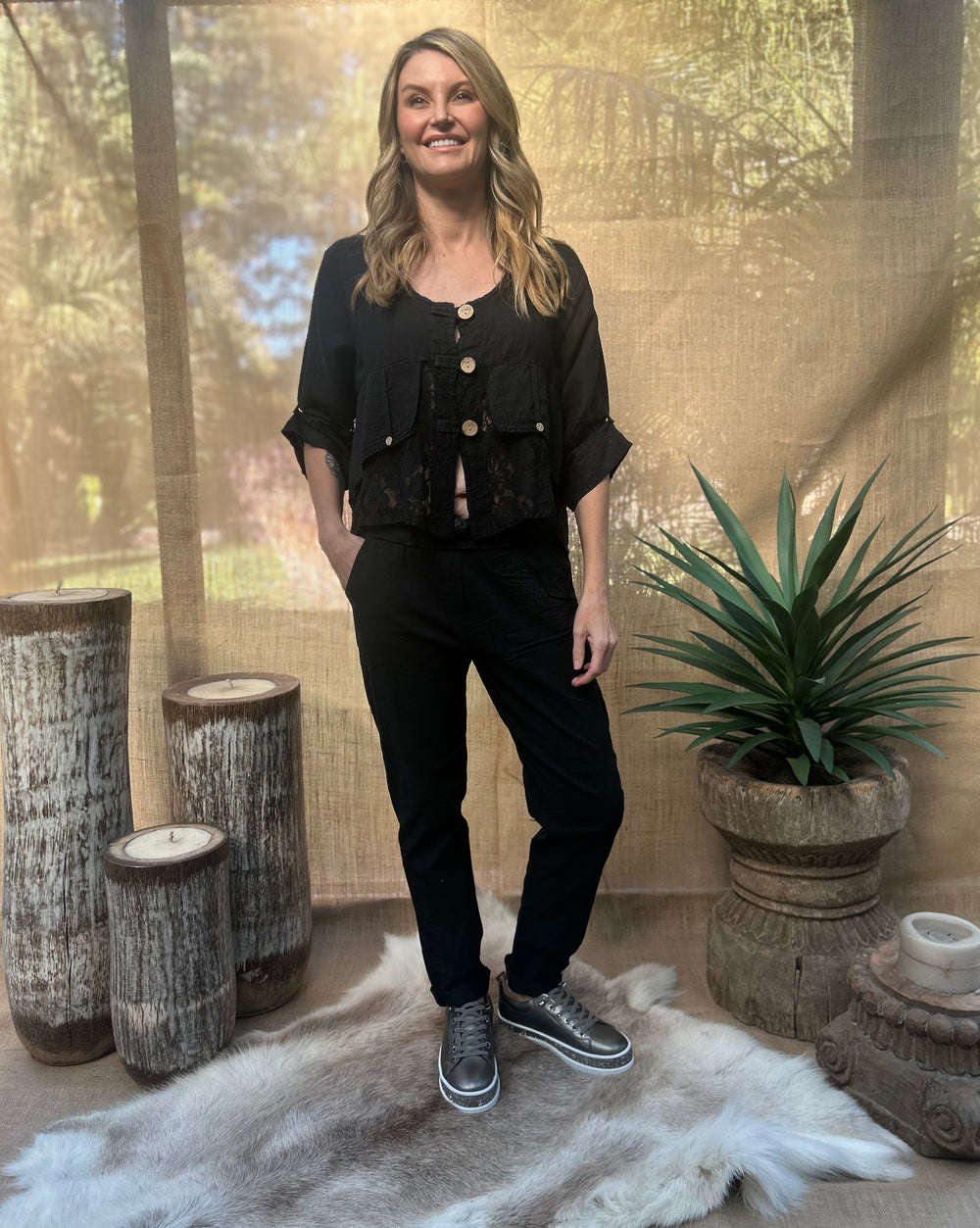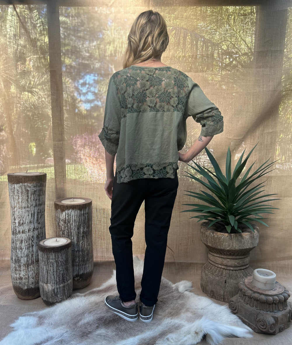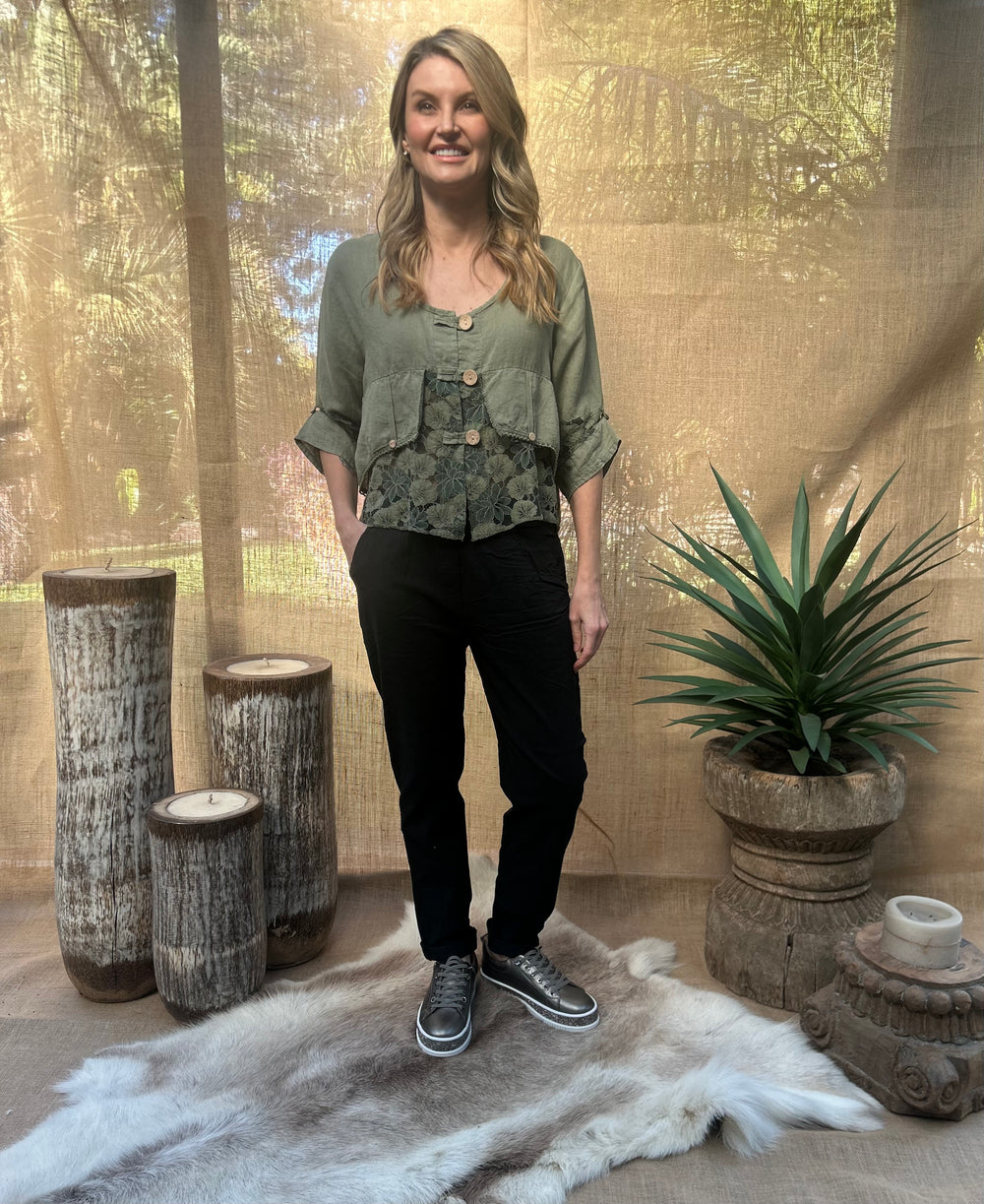 The Jordyn Lacey top is a gorgeous design that gives a layered appearance, with medium length button-up sleeves. It has an elegant look that could be ideal for many occasions, made from comfortable and soft linen.
