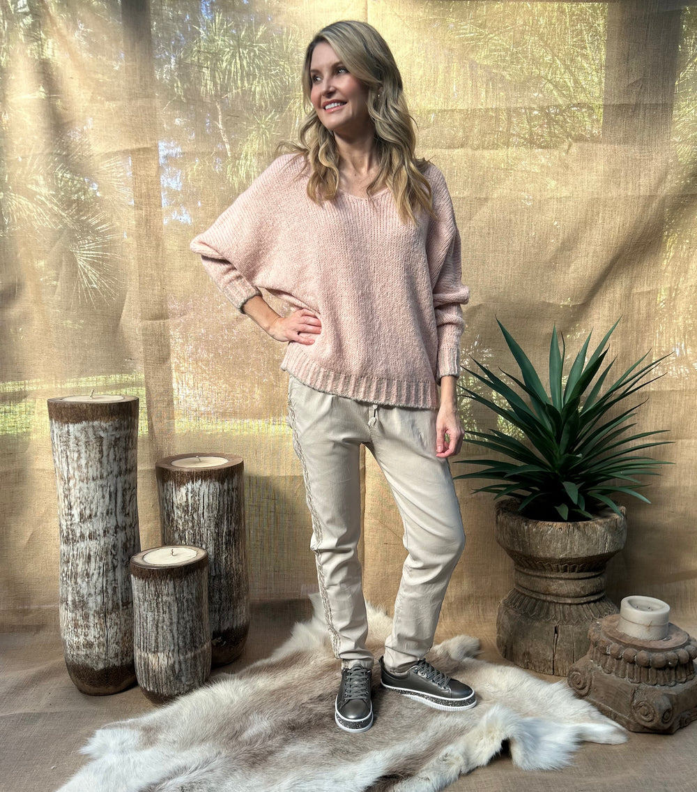 The Gorgeous Isabella pants feature a bold gold design all the way down each leg.