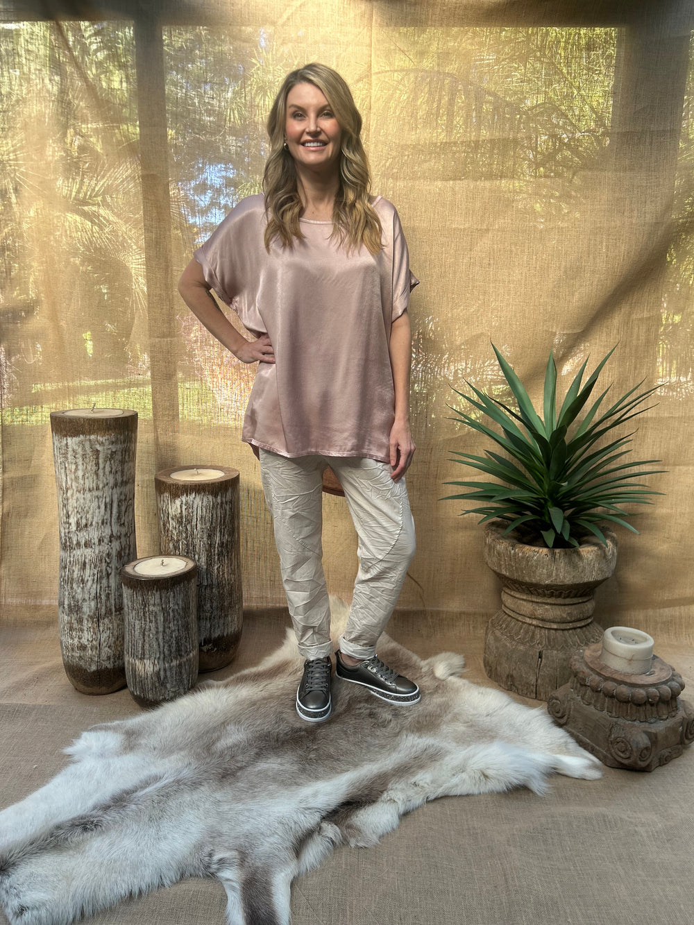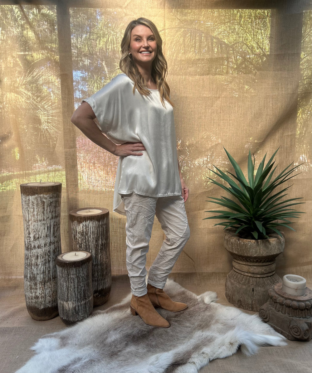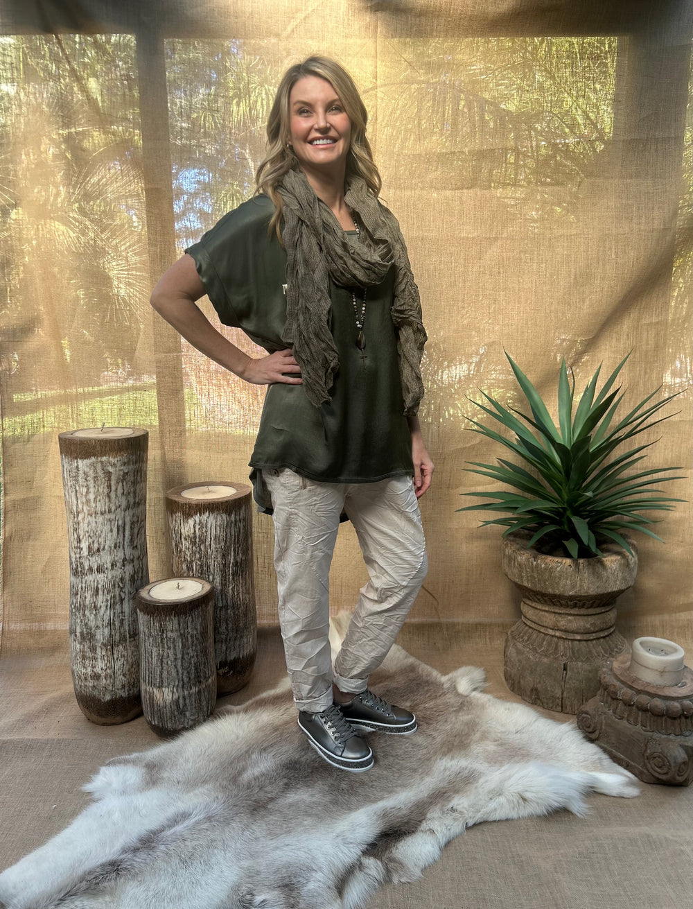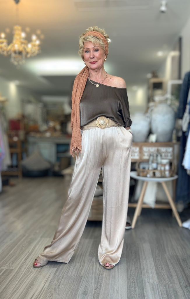As seen on Sharryn aka 'The Stylish Woman'. Sharryn has styled the Kendal Satin Top with our new Ellie Satin Pants, Sassy Belt and Lola Scarf.