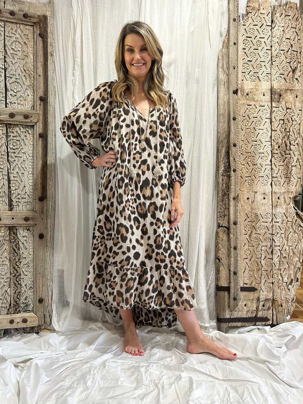 The gorgeous Mila Leopard Dress is made with 100% cotton , extremely flattering & curve friendly .