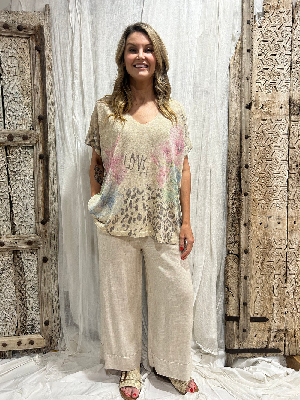 It sits so nicely & looks great paired with the Lia Linen Pants. Beautiful fine knit with gold thread.