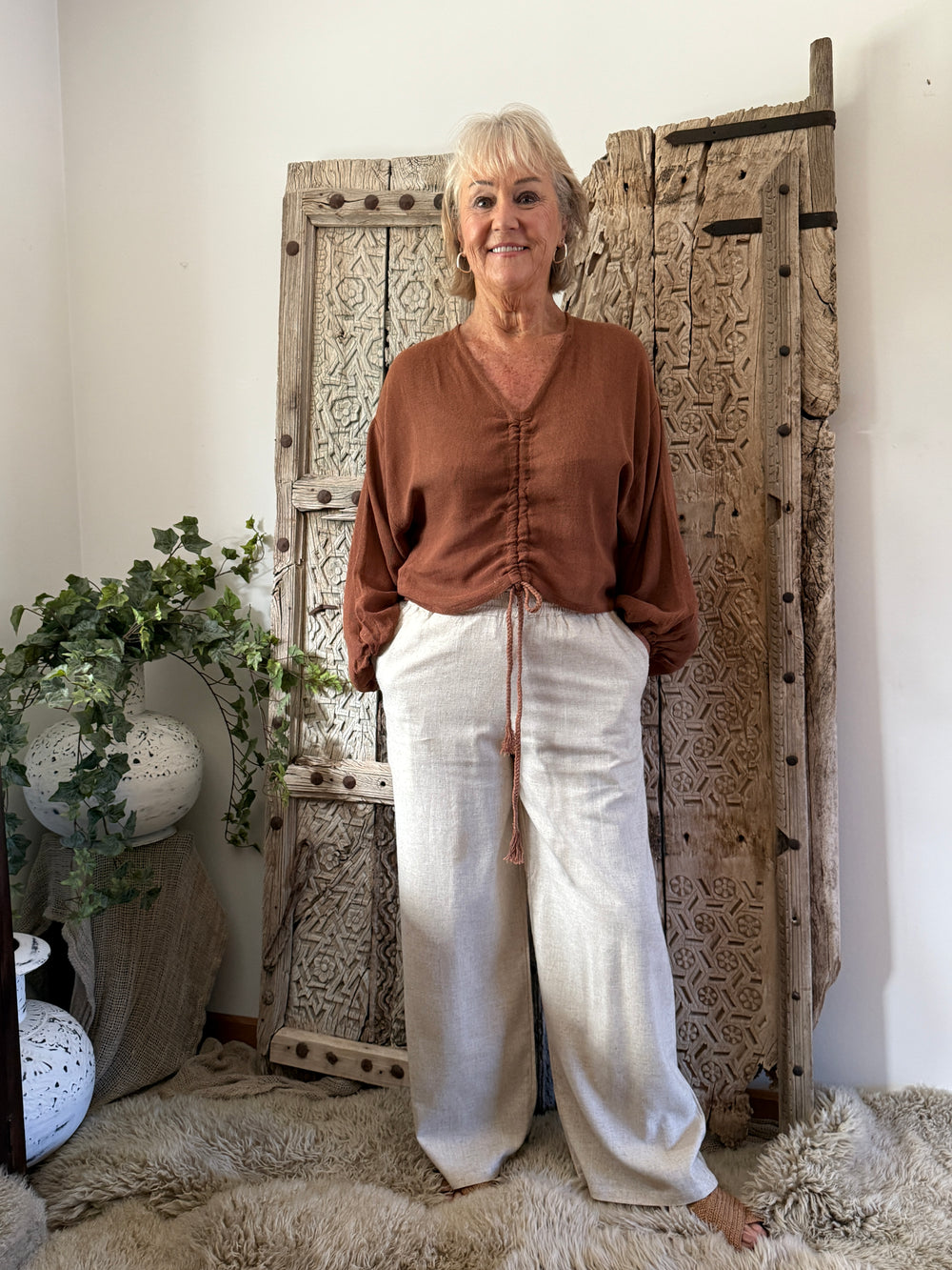 These relaxed, earthy-toned 100% muslin cotton blouse is designed for easy, everyday wear with a touch of refined detail. Featuring a flattering V-neckline and an adjustable front drawstring, it softly shapes the waist while maintaining a comfortable, flowy silhouette. The long sleeves and lightweight feel make it perfect for layering or wearing on its own through changing seasons.