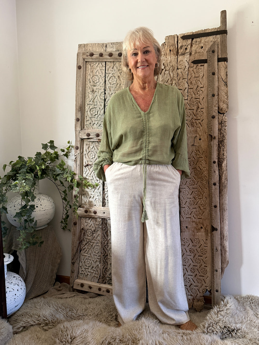 Style it loose for a casual look or cinch the drawstring for added definition—this versatile top pairs beautifully with linen pants, denim, or skirts.