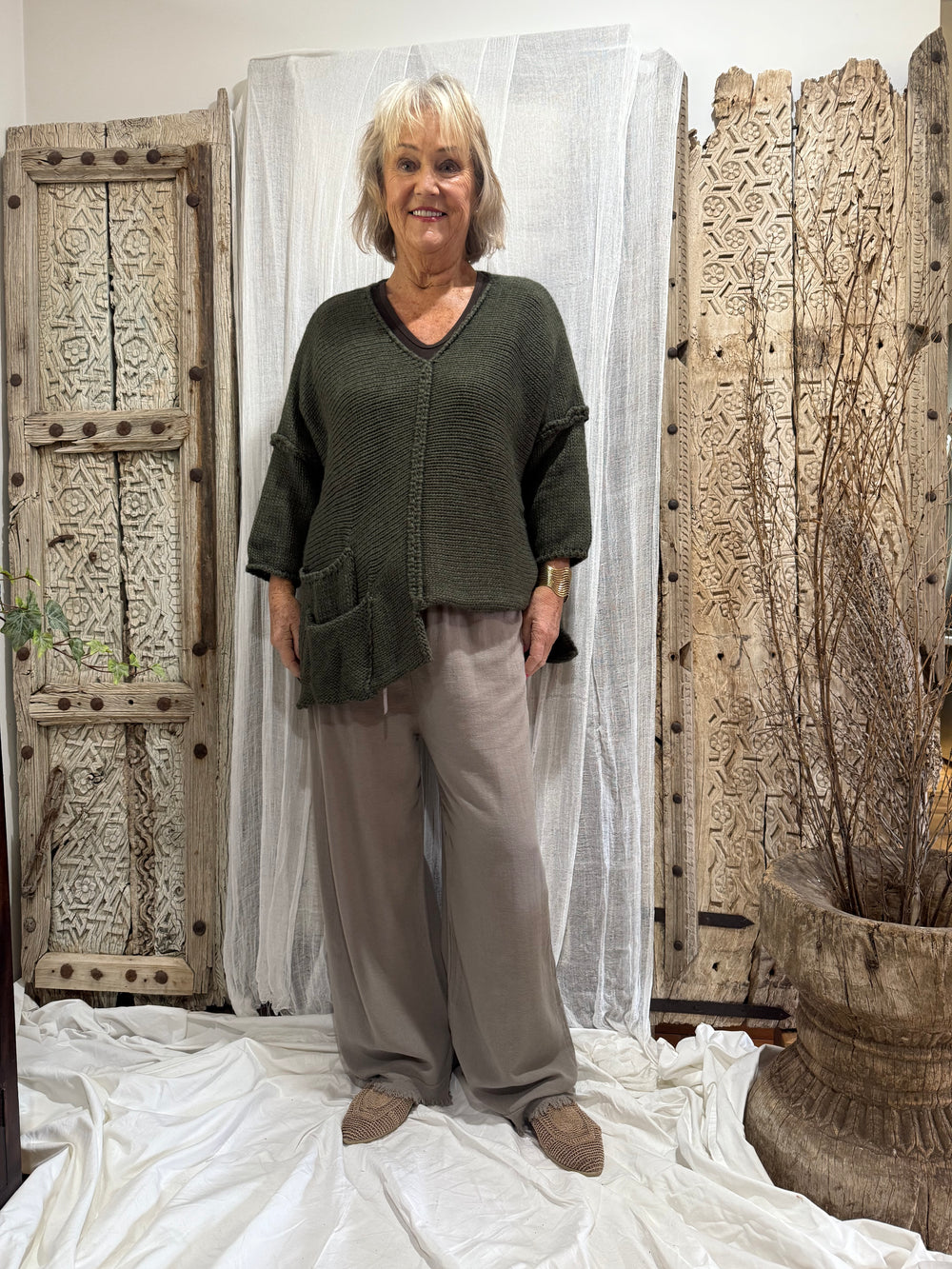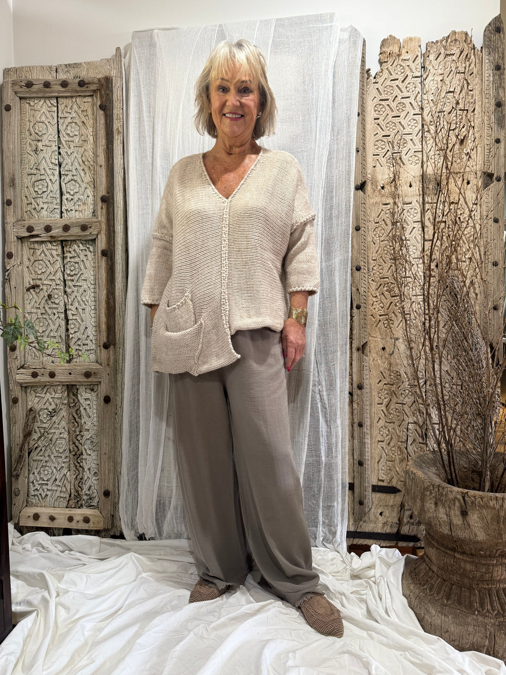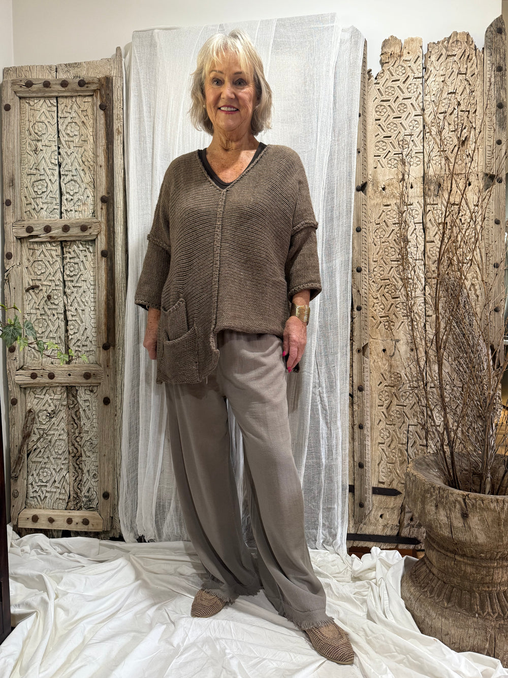 It has a casual, slouchy cut with dropped shoulders and slightly loose sleeves that fall around the elbows. The knit itself has a subtle texture, giving it a cozy but not bulky look.