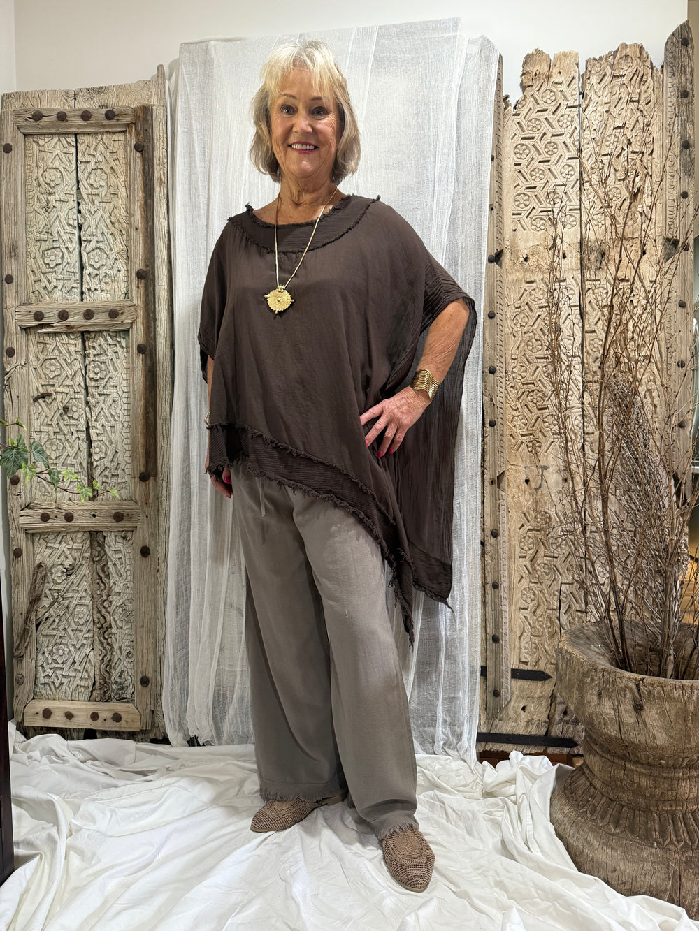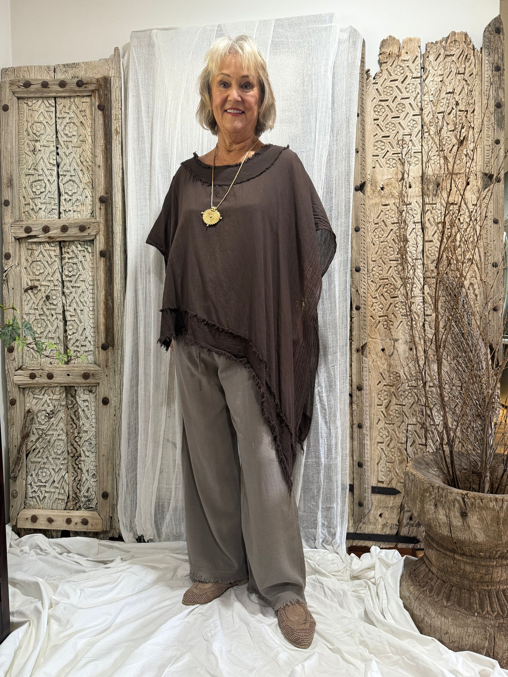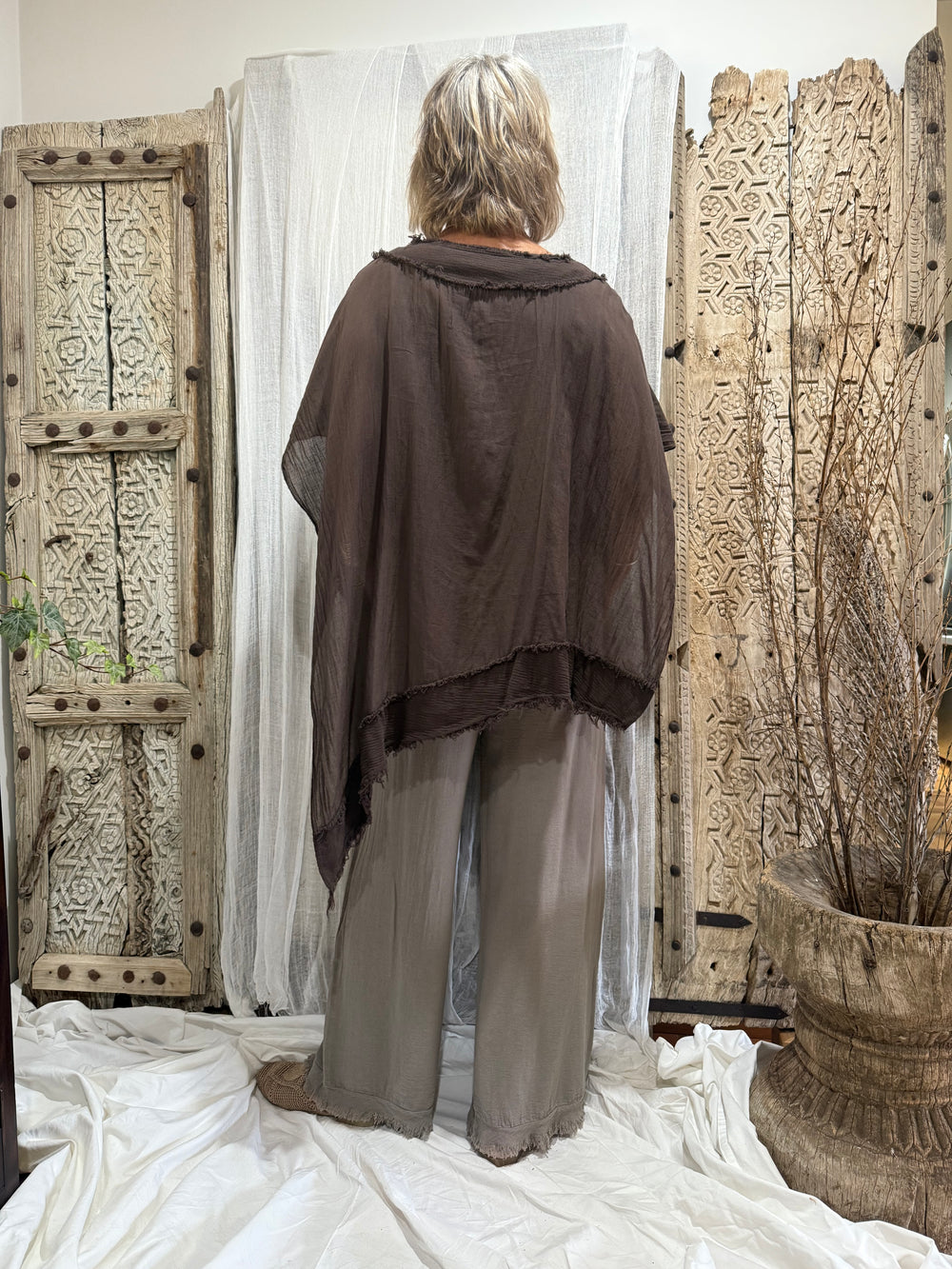 The Amari Top is a flowy, poncho-style blouse in a deep chocolate brown. It has a very relaxed and artistic feel, with details that make it stand out as a statement piece.